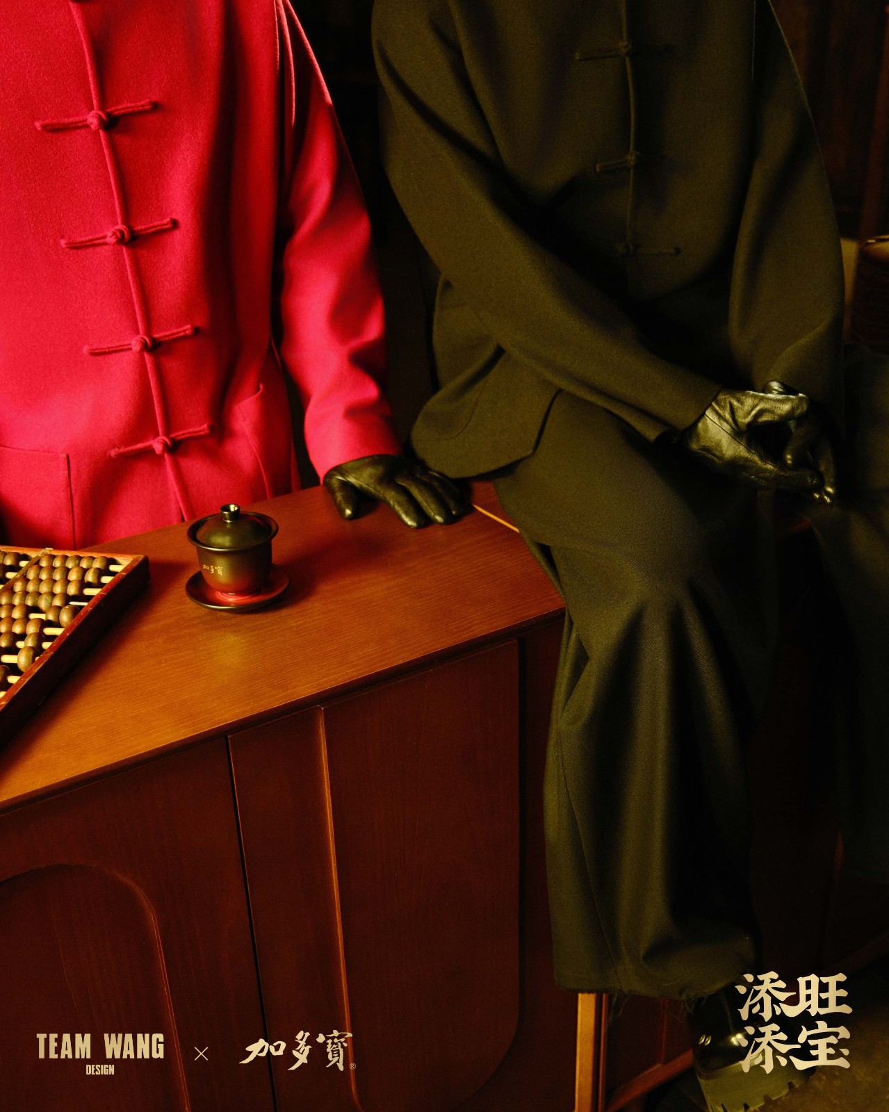 系列服装以唐装与新年为核心设计灵感,将传统服饰廓形与现代剪裁相结合。不同单品采用混纺毛呢、灯芯绒、及棉混纺等多种材质,结合新中式立领、手工盘扣等细节设计,让唐装在保留传统神韵的同时展现更潮流化的当代表达。包括背部加多宝品牌标识性「寳」字刺绣、TEAM WANG DESIGN 金属标牌、「TEAM 寳」MONOGRAM 提花里布等元素,也进一步强化了系列的专属识别度,使这一系列在视觉、触感与情绪表达层面同时“添旺添宝”,自然融入当代日常穿搭场景,呈现充满节日气息与文化质感的中式新年造型。