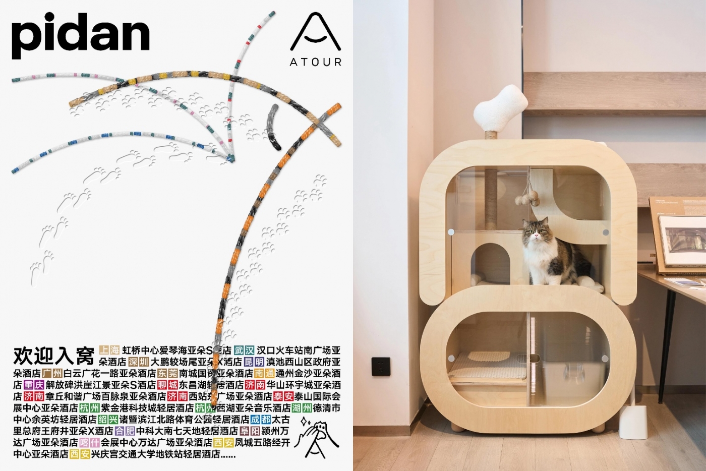 亚朵联手宠粮品牌Pidan升级了猫咪友好房间,邀请100只小猫入窝度假。猫爬架、水食碗、抓柱、砂盆等宠物生活用品一应俱全,让人直呼贴心。