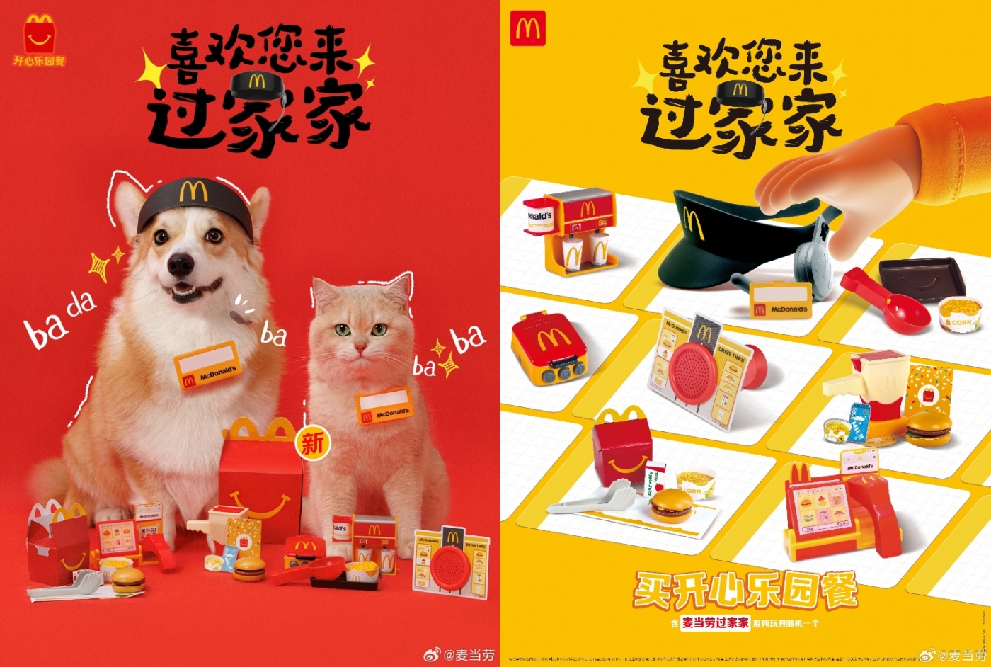 麦当劳为萌宠们准备了打工仔的全套装备,包括收个钱钱、员工帽和牌牌、得来速点餐机等8款玩具,让麦当劳的员工形象在人宠共创的过程中更加深入人心。